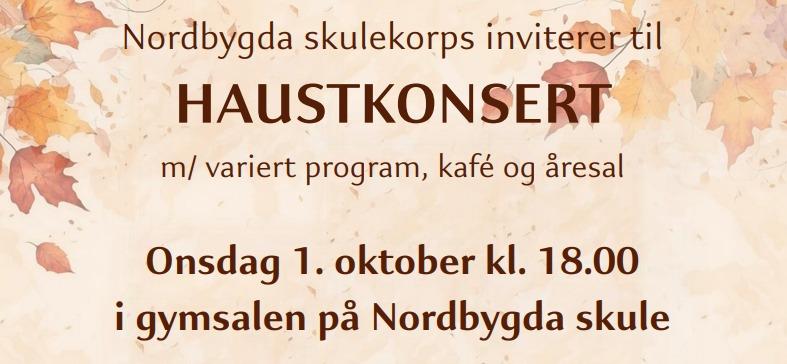 Nordbygda skulekorps inviterer til Haustkonsert m/variert program, kafe og åresal